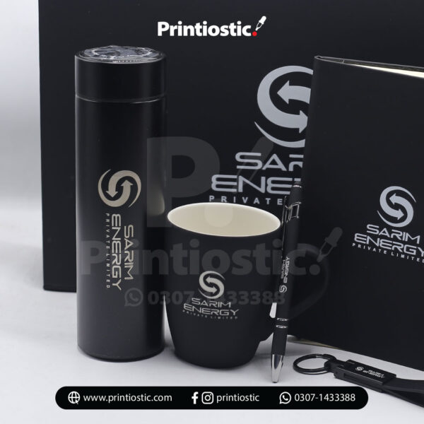The kit includes useful branded items such as a custom notebook, mug, pen, keychain and temperature bottle packed in a luxury black gift box. Every item can be printed or engraved with your company logo to create a professional and memorable first impression. Printiostic also offers fully customized packaging in your brand colors and style.